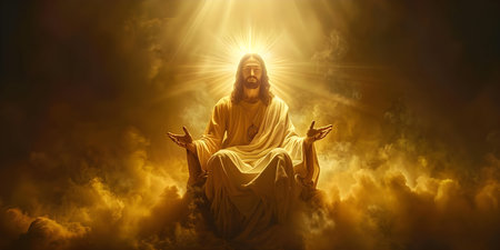 Jesus Christ seated on a glorious throne emanating divine light in heaven. Concept Heavenly Throne, Divine Light, Christian Iconography, Portrait Painting