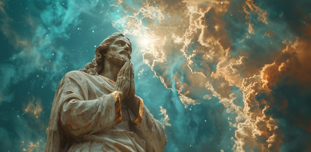 Jesus Christ praying to god with a dramatic sky background
