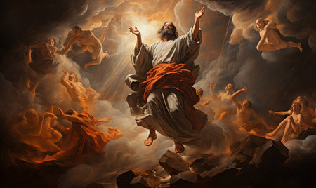 A painting depicting Jesus rising into the sky with divine light shining around him.