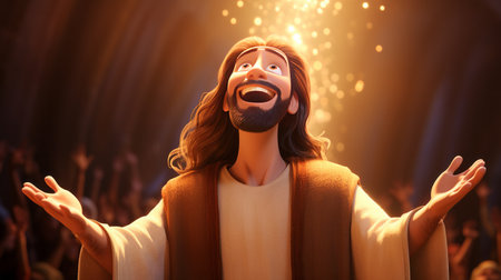 Pixar cartoon Jesus - Handsome young man with closed eyes singing at concert in theater