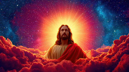 A spectacular, high-energy image of Jesus Christ emerging from vibrant, fiery red and orange clouds, illuminated by a brilliant sunburst and a cosmic, starry background, symbolizing the Second Coming, divine power, and glory. This image is excellent for themes of resurrection, judgment, and powerful spiritual declarations.
