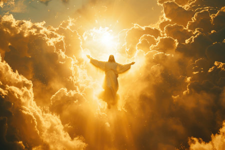 Jesus gazes heavens compassionate expression surrounded radiant clouds and beams light conveying blessings and protection Earth below.