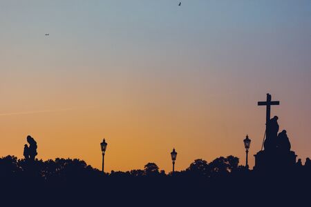 Silhouette of statues and city lights on Charles Bridge in Prague, Czech Republic. Medieval Gothic bridge, finished in the 15th century, crossing the Vltava River