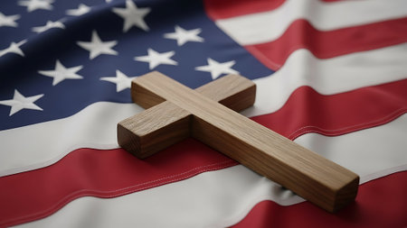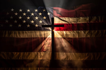 A powerful image featuring a wooden cross alongside an American flag, set against a backdrop of dramatic clouds and sunlight breaking through, symbolizing faith and patriotism.