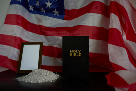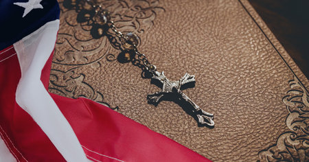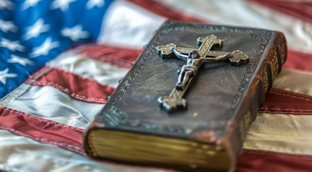 A vintage Bible rests on an American flag, representing the intertwining of faith and national identity, evoking a sense of historical significance and patriotic devotion.