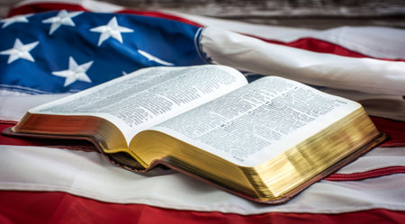A historic Bible lies open on a vibrant American flag, symbolizing the intertwining of faith and patriotism. Its worn pages reflect the enduring values of freedom and belief.