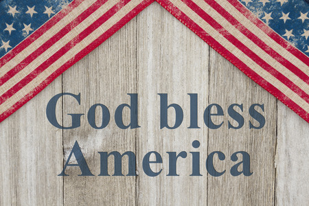 USA patriotic old flag on a weathered wood background with text God Bless America