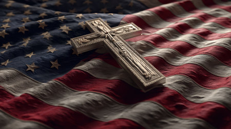 A cross placed on an American flag creates a powerful symbol of faith and patriotism. The intricate design of the cross contrasts beautifully with the textured fabric, evoking a sense of respect and unity.