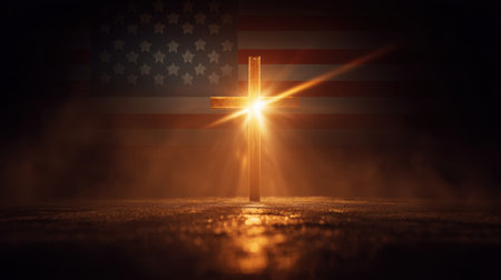 An ethereal cross radiates with soft light, symbolizing faith and hope, set against a subtle American flag backdrop, evoking deep emotion.