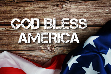 God Bless America text message with USA flag on wooden background