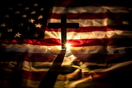 A radiant cross stands prominently in the foreground, beautifully lit against a softly blurred American flag, creating a serene and respectful atmosphere.