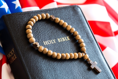 Holy Bible, USA flag and rosary beads on wooden background