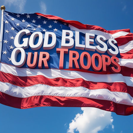 A close-up of the American flag with its stripes and stars visible, overlaid with the words GOD BLESS OUR TROOPS in white and red 3D letters.