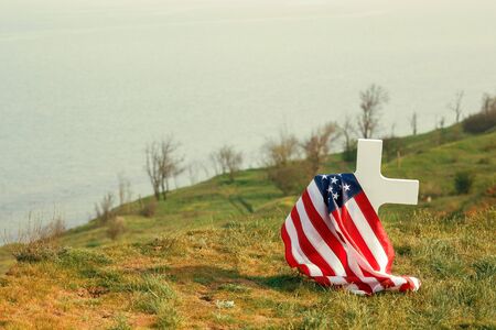 Wooden cross on the flag of the United States of America.