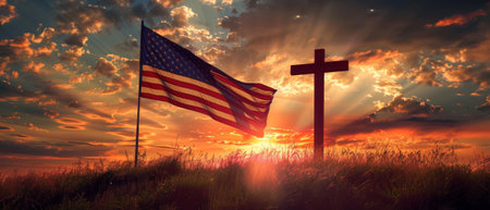 Sunset with the American flag and religious cross.