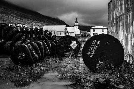 Landscape in the town of Ólafsfjörður in the north of Iceland. You can see abandoned objects in the old port.
