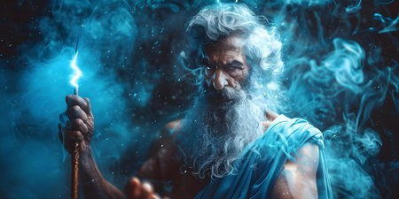 Powerful Zeus wields lightning bolt exuding strength and authority in mythology. Concept Mythology, Zeus, Lightning bolt, Strength, Authority