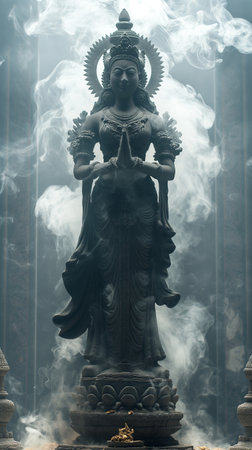 A majestic statue of a goddess stands against a vibrant blue sky. This colorful sculpture showcases intricate details and reflects deep cultural heritage and spirituality.