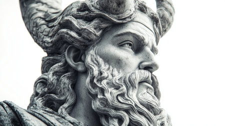 sculpture presents Ve a prominent Scandinavian god with intricate details highlighting his majestic horns and expressive facial features set against a plain white backdrop.