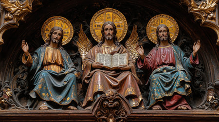 Majestic representation of Holy Trinity in traditional Orthodox style features God Father, Jesus Christ, and Holy Spirit as dove Rich colors enhance spirituality of scene