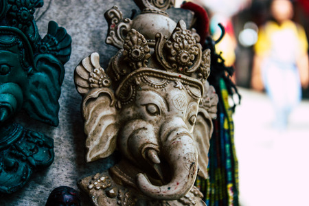 Pokhara Nepal September 18, 2018 Closeup of traditional Nepali decorative objects sold in a souvenir shop in Pokhara in the morning