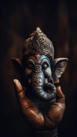 Beautiful figurine of Hindu god of wisdom, knowledge and new beginnings Ganesha against dark background.