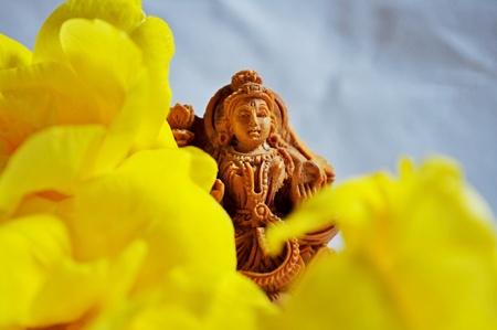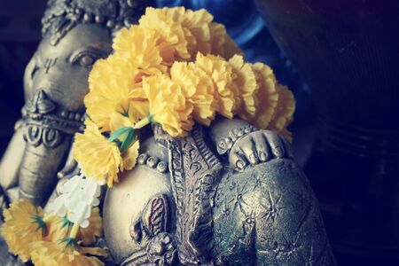 Ganesha god is the Lord of Success God of Hinduism on Marigold flowers Isolated on white background.
