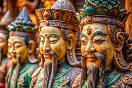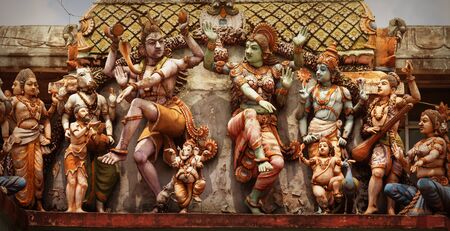 A closeup shot of Hindu ornaments and a group of Deity statues of a Hindu temple in Singapore