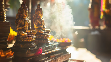 Sunlit brass idols of Indian deities placed on a traditional altar.