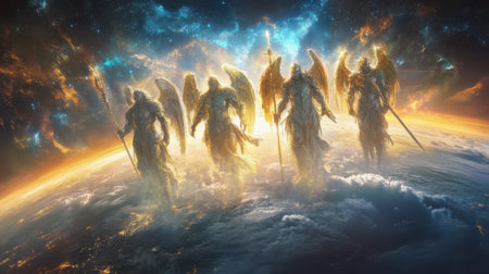 Five radiant angelic figures stand in formation above a vibrant Earth, surrounded by swirling clouds and a backdrop of dazzling cosmic colors. Their luminous presence evokes a sense of awesome and wonder.