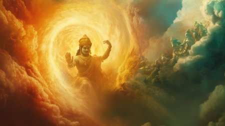 An ethereal image of Lord Vishnu emerging from the cosmic ocean, with celestial beings around him, representing the birth of the universe.