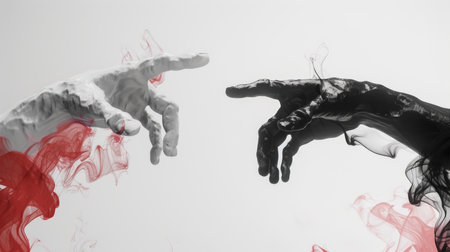 Abstract shadow silhouette of gesture touch by humans palms from sunbeam on wall during posing wrist and fingers in contrasting colors. Creation of Adam metaphor by Michelangelo