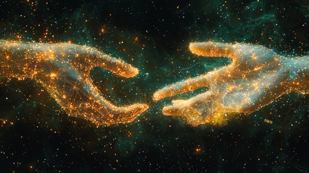A conceptual depiction of two hands connecting, visualizing the synergy between humanity and technology through virtual network-inspired visuals.
