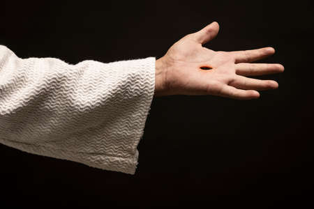 Jesus of Nazareth showing the wounds on his hands while praying on a dark night after being resurrected.