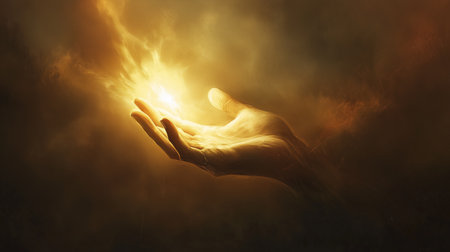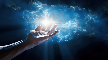 An open hand extends forward, with bright light radiating from its fingertips, creating a striking contrast against the darkness surrounding it.