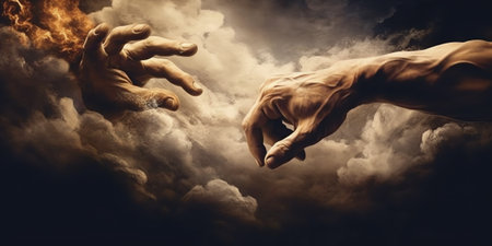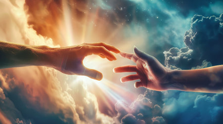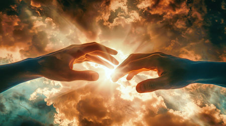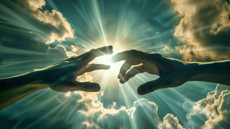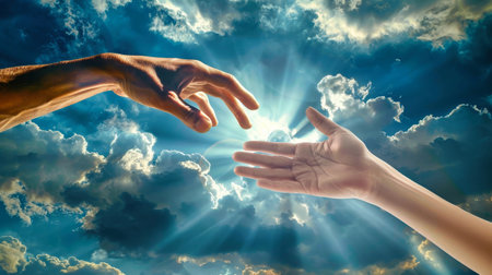 Two hands reaching towards each other in the vast sky, symbolizing unity, hope, and spirituality.