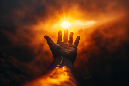 A close-up of a human hand reaching toward a radiant light in a serene landscape, symbolizing hope, inspiration, and new beginnings in life.