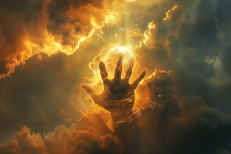A captivating image of a hand reaching out towards a bright light in a dark space, representing hope, energy, and creation. The interplay of light and dark creates a mystical atmosphere.
