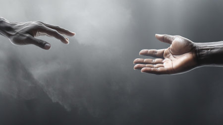 Close-up of two hands reaching out against a cloudy sky background, symbolizing hope, resilience, and the human desire for connection. --chaos