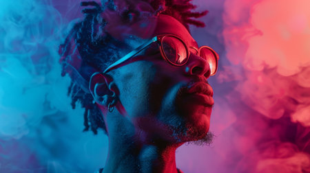 Portrait of a man with glasses in vibrant neon lighting, creating a modern and artistic scene, perfect for themes of fashion and contemporary lifestyle.