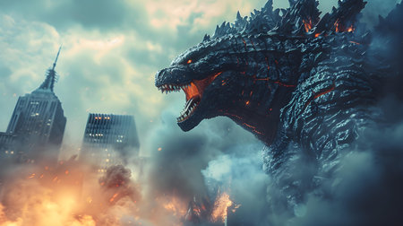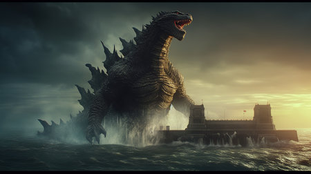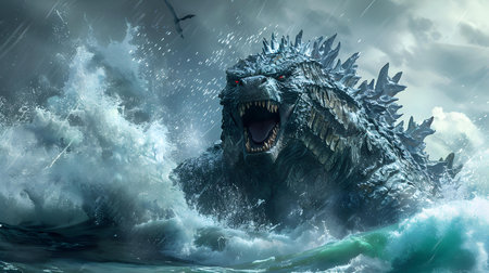 Godzilla emerges from ocean causing destruction disaster movie concept. Concept Destruction, Disaster, Godzilla, Emergence, Ocean