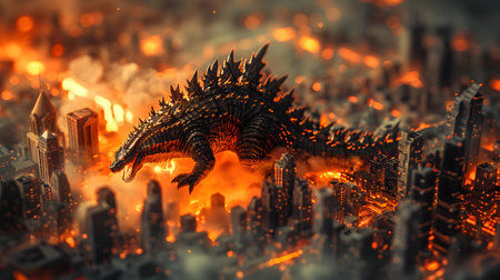 Miniature godzilla terrorizing cityscape with blazing flames in dramatic tiltshift shot. Concept Tilt-Shift Photography, Miniature Models, Dramatic Cityscape, Godzilla, Fire Effects