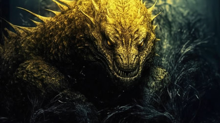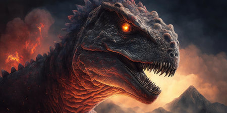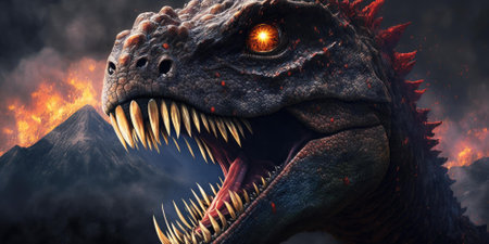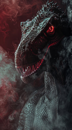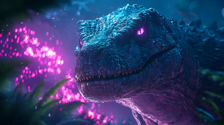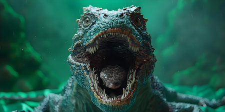 AI Generated. a fierce dinosaur emerges from the shadows showcasing its powerful jaws and intense gaze