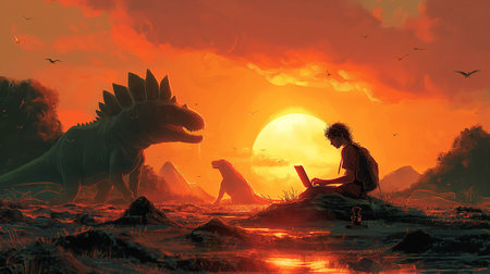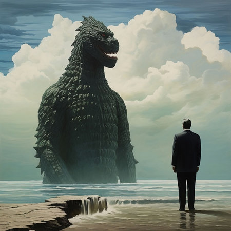 An AI generated illustration of A vibrant painting of a man standing beside a towering Godzilla figure,
