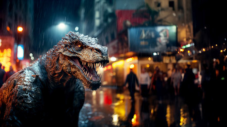 Fantastic dinosaur on the street of the night city illustration of the horrors of modern civilization, generated by AI
