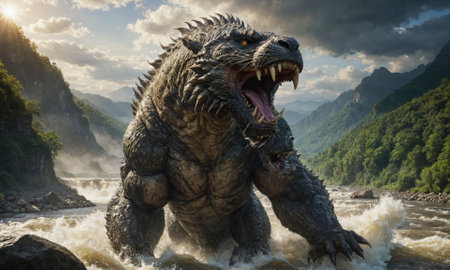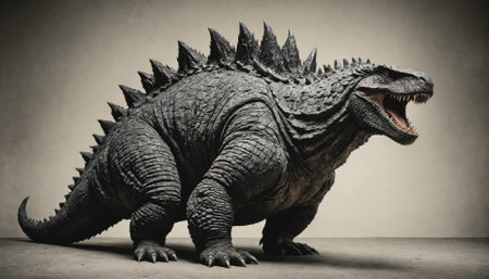 Macro shot of Godzilla roaring creating sound waves symbolizing natures power. Concept Nature's Power, Macro Photography, Godzilla, Roaring, Sound Waves