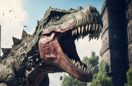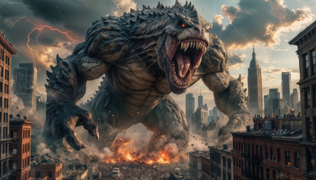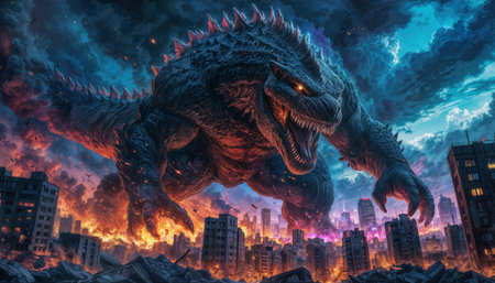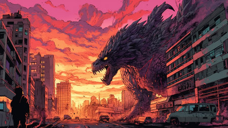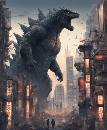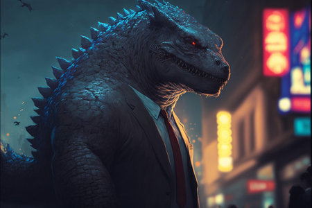 An AI generated illustration of a Godzilla-like creature standing in the street