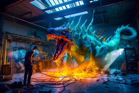 Man standing in front of large fire breathing dinosaur in building. Generative AI.