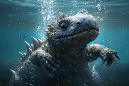 A formidable water dinosaur coming to the surface for air its huge form surfacing with a loud splash.. AI generation