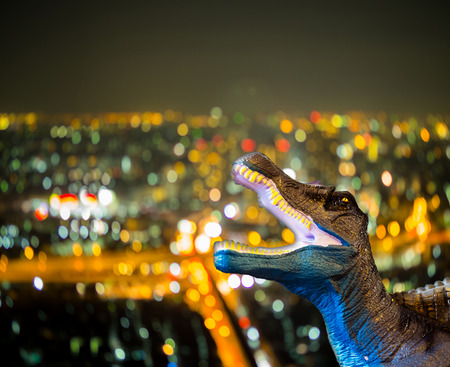 Silhouette of giant Dinosaur in foggy night. Creative decoration with little miniature. Burning misty background. Selective focus